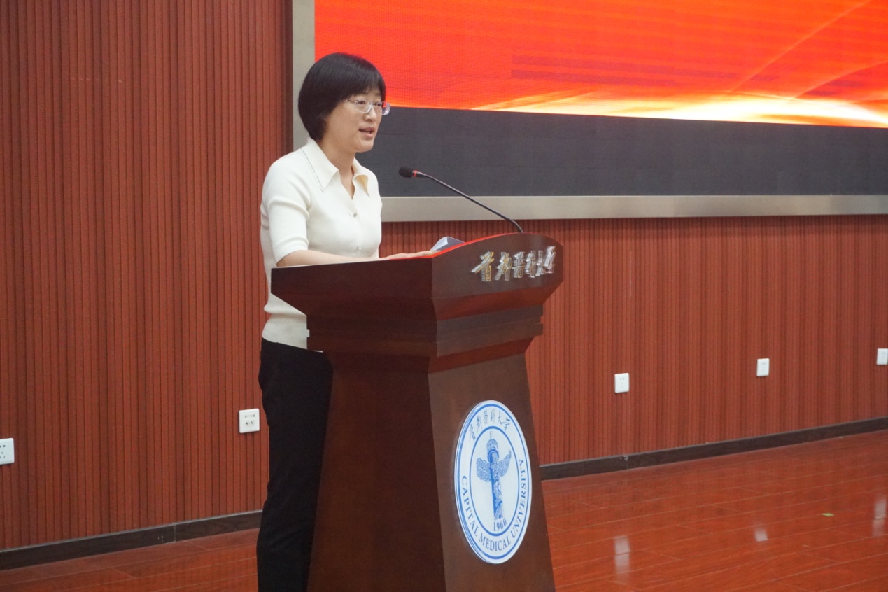 来自平谷教学医院的崔锦娜老师代表教师发言,为同学们送上了老师的期望和祝福。她希望同学们走出校园后保持奋斗的信念,珍惜工作、爱岗敬业。希望同学们时刻不要忘记学习。同时,能够练就强大的内心,勇于面对苦难,迎接挑战。
